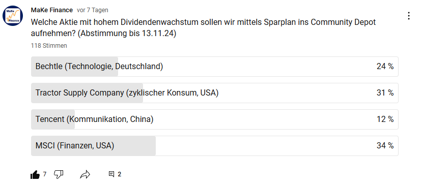 118 Stimmen gingen ein und am Ende machte MSCI das Rennen und gewann mit 34 % die Abstimmung und wird daher ins Community Depot aufgenommen.